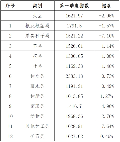 据对亳州中药材价格监测显示,2024年第一季度中药材价格指数平均数值为1621.97点(以2017年3-4月份平均价格为基期),与去年第四季度的1671.24点相比,下跌49.27点,跌幅2.95%。
