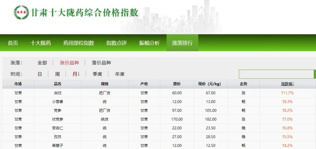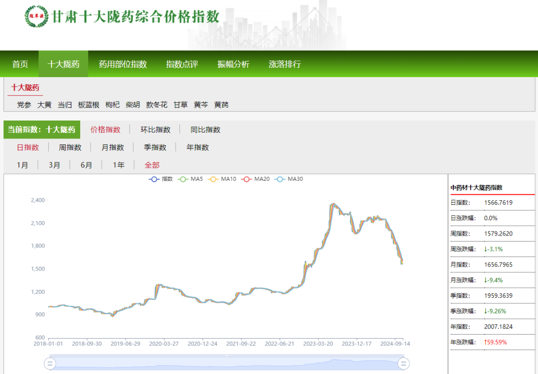 甘肃十大陇药(当归、黄芪、党参、大黄、板蓝根、枸杞、柴胡、款冬花、甘草、黄芩)价格监测显示,2024年10月份甘肃十大陇药价格指数为1656.80点(以2018年1月份平均价格为基期),与上期1828.80点(2024年9月1日)相比,下跌170点,跌幅9.4%。
