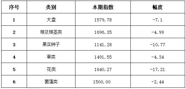 (1)根及根茎类:上月指数收于1785.37点,本月指数1696.35点,下跌89.02点,跌幅4.99%。