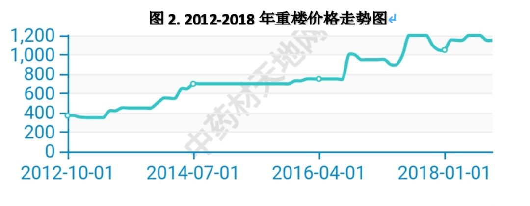 通过中药材天地网查询信息得知,由于野生资源无序采挖,野生重楼从2001年供应780吨左右,逐年下降到2017年产200吨左右,在近20年里呈明显加速下滑态势。期间,家种重楼产量仅有350吨左右,最高的2017年家种重楼供应500吨左右。由于资源紧张,直接造成重楼行情呈线性上涨趋势,2017年10月达到历史最高价突破了千元大关,与2010年1月份260元/公斤左右相比,涨幅高达350%以上。随着2010年前后人工规模化种植的重楼开始陆续进入采挖期,加之市场行情的持续高位,刺激种植户采挖积极性,家种重楼产能已能陆续填补市场需求,重楼价格也从2018年年初的1160元滑到目前的800元以下,多地药材市场显示近期货源走动缓慢,行情疲软运行态势明显,重楼已经不在康美中药网热门品种之中,后期行情将会进一步下行,业界应当高度关注。