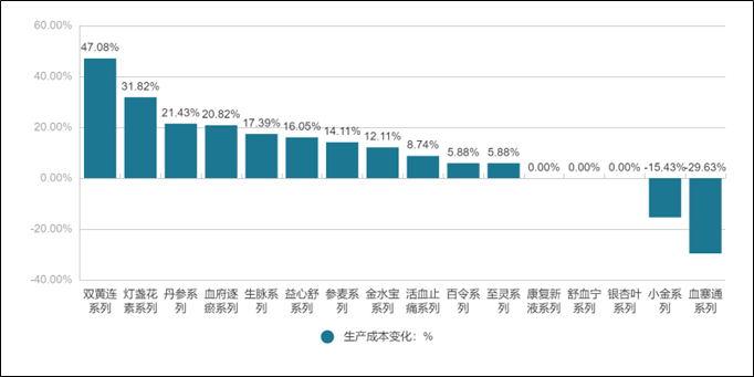 从中成药成本看:原料上涨带动中成药成本上涨显著,导致企业利润空间急剧压缩,227个中成药品种共涉及16个药品系列。