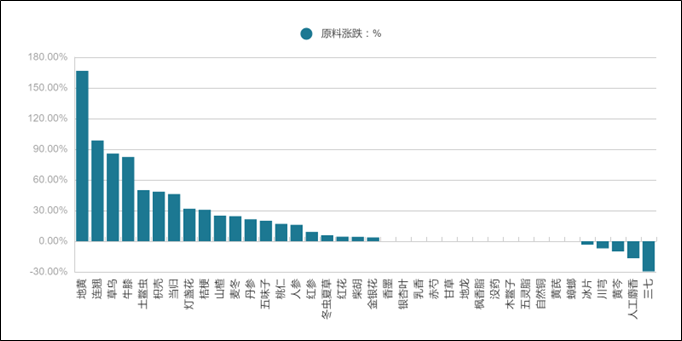 从原料涨跌看:原料上涨品种占比过高,生产成本上涨明显。227个中成药品种涉及原料共有38个。其中行情上涨品种有地黄、连翘、草乌、牛膝、土鳖虫、枳壳、当归、灯盏花、桔梗、山楂、麦冬、丹参、五味子、桃仁、人参、红参、冬虫夏草、红花、柴胡、金银花,共计20个(见图4),占比52.63%,持平品种有13个香墨、银杏叶、乳香、赤芍、甘草、地龙、枫香脂、没药、木鳖子、五灵脂、自然铜、黄芪、蟑螂,共计13个,占比34.21%;下滑品种有冰片、川芎、黄芩、人工麝香、三七,共计5个,占比13.16%。