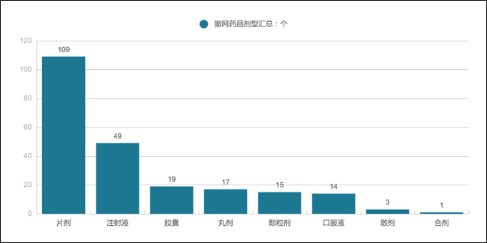 从撤网药品的剂型分类看:片剂产品剂型占比最高,注射液产品剂型位居第二。撤网的227个药共涉及8种剂型,其中片剂产品有109种,占比48.02%;注射液产品有49个,占比21.59%;胶囊产品有19个,占比8.37%。剂型前三产品累计占比达到了77.97%。