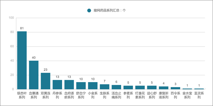 撤网的227个品种共涉及16个系列,其中银杏叶系列产品有81个,占比35.68%;血塞通系列产品有40个,占比17.62%,双黄连系列产品有23个,占比10.13%;丹参系列和血府逐瘀系列产品各有13个,分别占比5.73%。系列分类前五产品累计占比达到了74.89%。