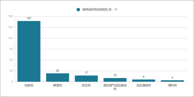 227个品种共涉及6个药品类别,其中祛瘀剂有167个,涵盖祛丹参系列、灯盏花素系列、舒血宁系列、血府逐瘀系列、血塞通系列、益心舒系列和银杏叶系列,占比73.57%;解表剂有23个,涵盖双黄连系列,占比10.13%;扶正剂有17个,涵盖百令系列、参麦系列、金水宝系列、生脉系列、至灵系列,占比7.49%。药品类别前三累计占比达到了91.19%。