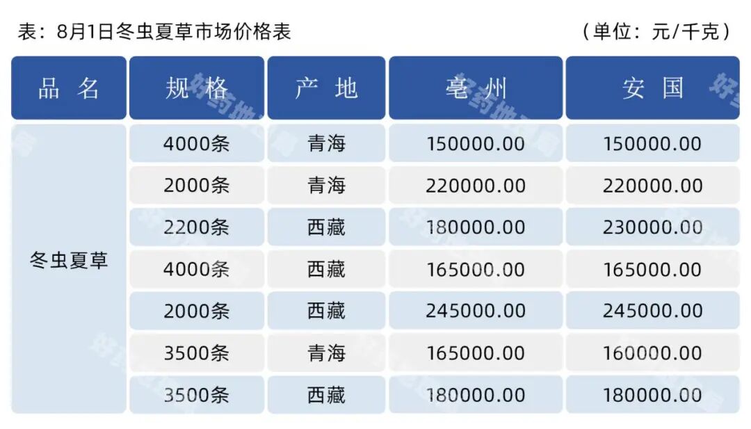 今天已到8月,但青海和西藏产区的冬虫夏草价格仍然没有变动,坚挺在14万-24万之间。货源以零星走动为主,不过关注的商家比之前多了。具体来看,青海方面本地2000条价位在22万左右,4000条最低价14万。西藏冬虫夏草价格2000条价格14万,4000条成交价145000元。随着两地冬虫夏草产新即将结束,因暴雨影响导致货源运输可能受阻,预计冬虫夏草价格可能会有波动,有库存的商家或持惜售心里。
