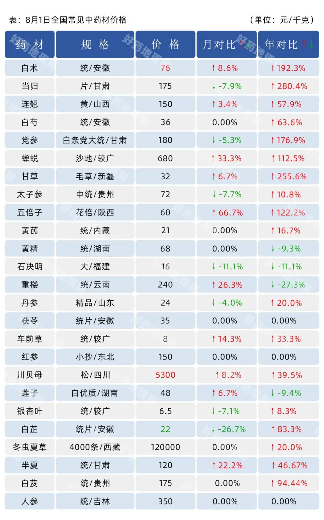 8月1日全球药材行情|大宗品种保持高位,川贝母飞涨400,多空交织下中药材市场能否延续涨势?