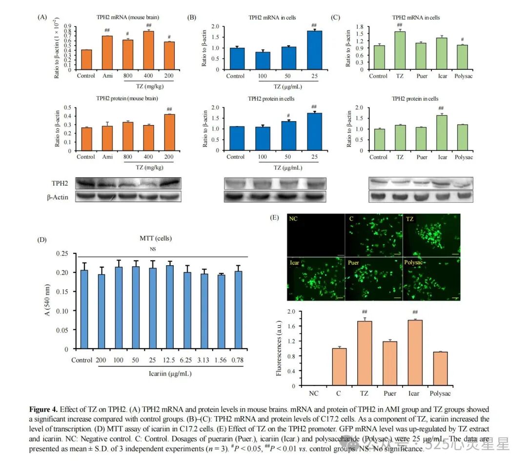 TZ、葛根素、淫羊藿苷和太子参多糖对C17.2细胞的作用结果显示淫羊藿苷对TPH2转录和翻译的促进作用更为明显。我们将TPH2启动子的质粒转染到293T细胞中,发现TZ和淫羊藿苷可以提高TPH2启动子驱动的GFP的表达,说明TZ通过影响TPH2启动子提高脑内TPH2水平。这一结果提示,由于GFP蛋白在哺乳动物细胞中不表达,说明TPH2是TZ和淫羊藿苷的独立特异性靶点[37]。