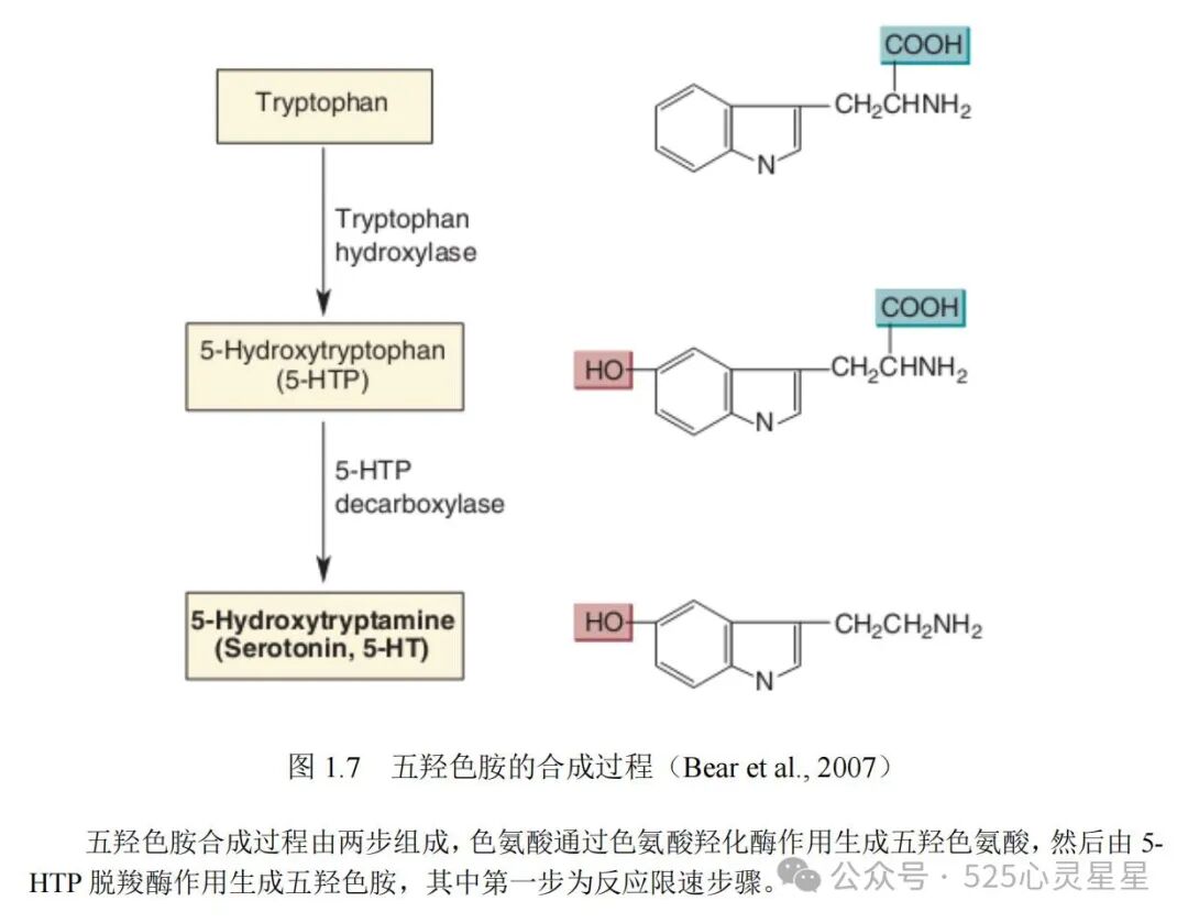 脑组织内5-HT的含量由5-HT的合成和代谢情况共同决定。其中5-HT的合成是由色氨酸经过色氨酸羟化酶羟化形成5羟色氨酸,然后经由脱羧酶形成5-HT的两步反应。其中色氨酸羟化酶是整个反应中的限速酶。而在脑内,主要由色氨酸羟化酶II(TPH2)催化这一反应。