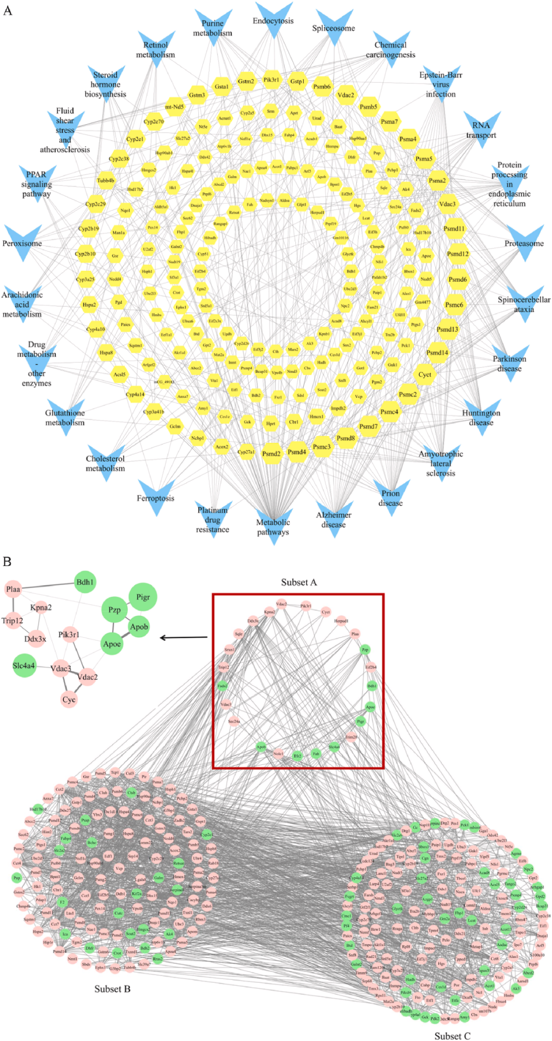 图5 网络分析。(A)富集信号通路及其相应蛋白质的网络。蓝色箭头表示信号通路。黄色节点代表显著差异表达的蛋白质,其大小由Cytoscape产生的反映其自身连接蛋白质数量的Degree值定义。节点越大,与其他蛋白质的连接就越多。(B)显著差异表达蛋白质的功能分类网络。亚组A:促进肝损伤的蛋白质;B亚组:应激反应蛋白或保护肝脏的蛋白;亚组C:参与基础代谢的蛋白质。绿色节点代表下调的蛋白质;粉红色的节点代表上调的蛋白质;灰色线表示蛋白质之间的相互作用。在亚组A的放大显示中,节点大小由倍数变化决定,边缘宽度由组合得分决定。