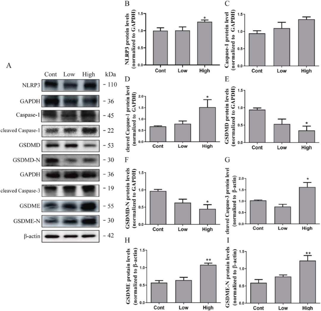 图8箭叶淫羊藿对细胞凋亡相关蛋白的影响。(A)代表性的蛋白质印迹扫描。(B)NLRP3的量化。(C)caspase-1的定量。(D)裂解的caspase-1的定量。(E)GSDMD的量化。(F)GSDMD-N的定量。(G)裂解的caspase-3的定量。(H)GSDME的量化。(I)GSDME-N的量化。数据以平均值±标准误差表示。Cont,对照组;Low,低剂量箭叶淫羊藿水提取物组;High,高剂量箭叶淫羊藿水提取物组。与对照组比较,*p<0.05、**p<0.01。
