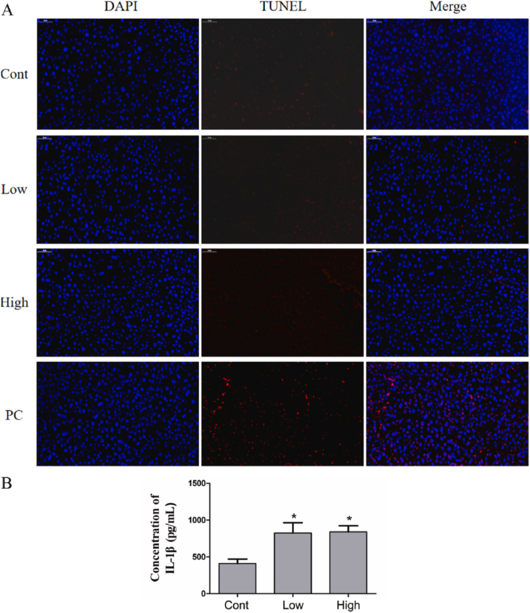 图3 箭叶淫羊藿对细胞凋亡和炎性细胞因子IL-1β的影响。(A)肝组织TUNEL染色的代表性图像(40×)。Cont,对照组;Low,低剂量箭叶淫羊藿水提取物组;High,高剂量箭叶淫羊藿水提取物组;PC,凋亡阳性对照。阳性对照是用80mg/kg补骨脂素处理14天的小鼠获得的肝组织。(B)箭叶淫羊藿能增强肝组织中IL-1β的表达。数据以平均值±标准误差表示。Cont,对照组;Low,低剂量箭叶淫羊藿水提取物组;High,高剂量箭叶淫羊藿水提取物组。与对照组比较*p<0.05。