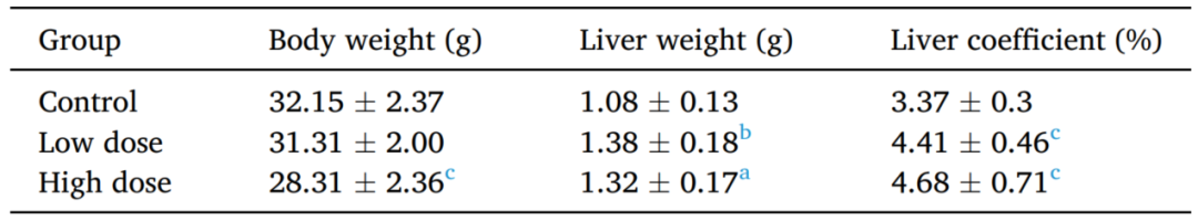 与对照组相比,高剂量箭叶淫羊藿处理的小鼠体重显著降低(p<0.05)。与对照组相比,低剂量和高剂量箭叶淫羊藿给药组的肝脏重量和系数均显著增加(p<0.05)(表1)。