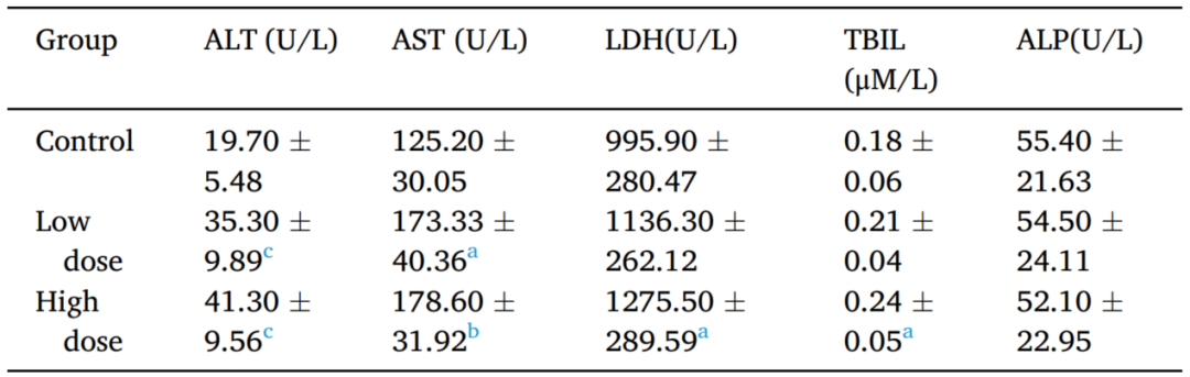 与对照组相比,低剂量和高剂量箭叶淫羊藿提取物处理的小鼠血清ALT和AST水平显著升高(p<0.05,p<0.01,p<0.001)。高剂量箭叶淫羊藿处理的小鼠血清TBIL和LDH水平显著升高(p<0.05)(表2)。