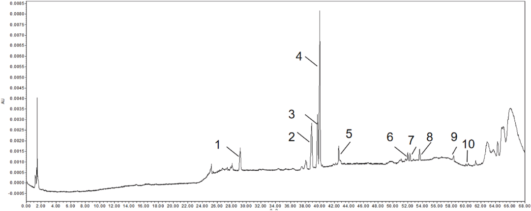 图1箭叶淫羊藿水提取物的色谱图。1. 朝藿定A;2. 朝藿定B;3. 朝藿定B;4.淫羊藿苷;5.箭藿苷A;6. 淫羊藿次苷I;7. 箭藿苷B;8. 宝藿苷I;9. epimedokoreanin B;10. 淫羊藿素。