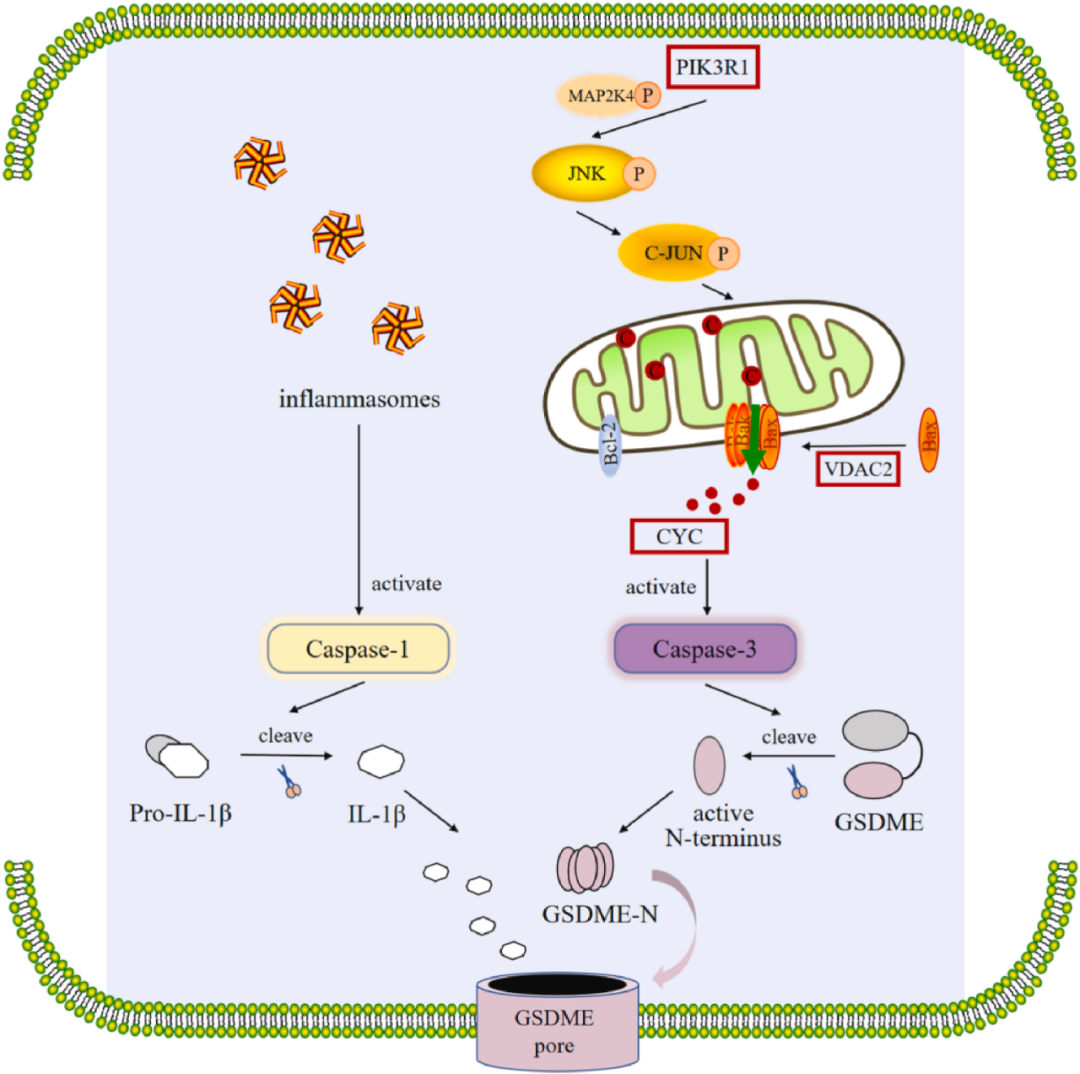 由于高剂量的箭叶淫羊藿水提取物会导致小鼠严重的肝损伤,因此分析了高剂量组和对照组之间显著差异表达的蛋白质。蛋白质组学分析表明,PIK3R1、VDAC2和CYC在参与肝损伤的蛋白质中的倍数变化和综合评分值较高,可能是箭叶淫羊藿诱导肝毒性的关键特征。PIK3R1在胆汁淤积小鼠中增加,胆汁淤积小鼠的肝纤维化可以通过下调PIK3R1来减轻,表明PIK3R1对肝损伤至关重要。此外,PIK3R1激活JNK信号通路;活化的JNK随后可以激活c-Jun和其他蛋白质,如Bcl-2家族成员,从而调节炎症、存活和细胞死亡。JNK磷酸化并导致Bcl-2的磷酸化或其从Bcl-2/Bax复合物中解离,从而诱导细胞凋亡或caspase介导的炎症反应。Bax的有效促凋亡功能依赖于VDAC2,VDAC2的缺失消除了Bax与线粒体复合物的结合。在本研究中,PIK3R1、p-MAP2K4、p-JNK/JNK、p-c-Jun、VDAC2、Bax、CYC和裂解的caspase-3被上调,而抗凋亡蛋白Bcl-2被箭叶淫羊藿显著抑制,这表明JNK信号通路被箭叶淫羊藿激活(图9)。先前的研究表明,JNK的激活最终导致细胞凋亡。肝损伤过程中JNK的磷酸化和caspase-3的表达增加。多组学研究还表明,肝损伤与细胞凋亡密切相关。然而,TUNEL染色未能揭示箭叶淫羊藿给药小鼠肝组织中的明显凋亡,表明箭叶淫羊藿可能通过其他机制诱导肝损伤。