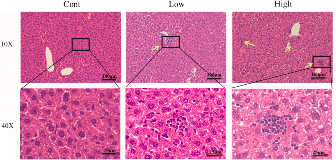 图2 用箭叶淫羊藿提取物处理的小鼠肝组织的组织病理学变化。Cont,对照组;Low,低剂量箭叶淫羊藿水提取物组;High,高剂量箭叶淫羊藿水提取物组。