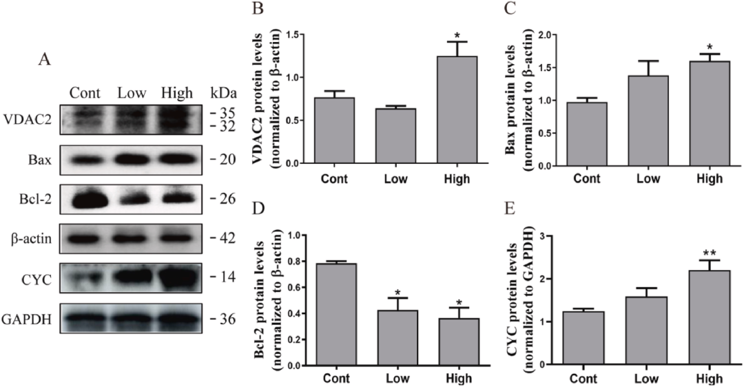 图7 箭叶淫羊藿对细胞凋亡相关蛋白的影响。(A)VDAC2、Bax、Bcl-2和CYC的代表性蛋白质印迹扫描。(B)VDAC2的量化。(C)Bax的定量。(D)Bcl-2的定量。(E)CYC的量化。数据以平均值±标准误差表示。Cont,对照组;Low,低剂量箭叶淫羊藿水提取物组;High,高剂量箭叶淫羊藿水提取物组。与对照组比较,*p<0.05、**p<0.01。