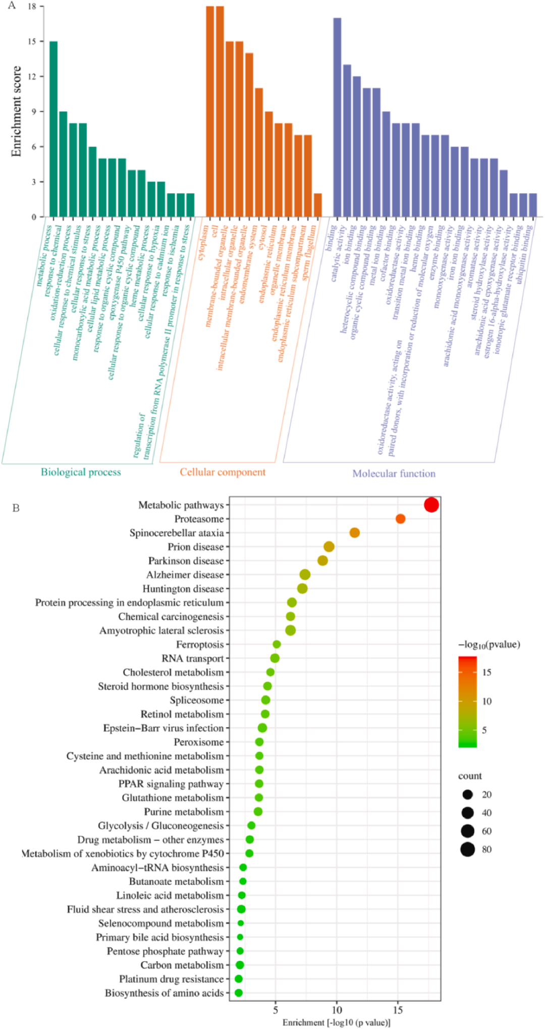 图4 高剂量箭叶淫羊藿对显著差异表达蛋白质的富集分析。(A)显著差异表达蛋白质的GO分析。(B)显著差异表达蛋白质的KEGG分析的气泡图。