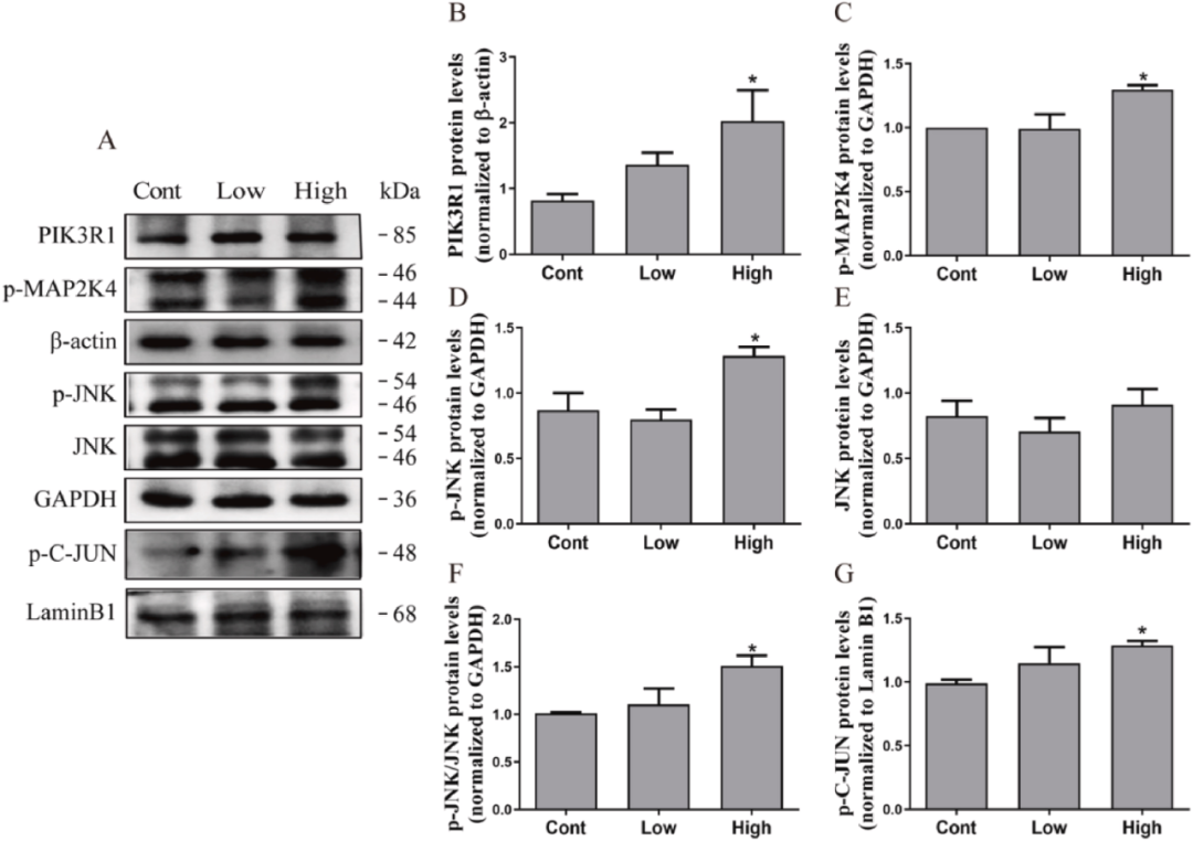 图6E.箭叶淫羊藿上调参与JNK信号通路的蛋白质的表达。(A) PIK3R1、p-MAP2K4、pJNK、JNK和p-c-Jun的代表性蛋白质印迹扫描。(B)PIK3R1的定量。(C) pMAP2K4。(D)p-JNK的定量。(E)JNK的量化。(F)pJNK/JNK的定量。(G)p-c-Jun的量化。Cont,对照组;Low,低剂量箭叶淫羊藿水提取物组;High,高剂量箭叶淫羊藿水提取物组。数据以平均值±标准误差表示。与对照组比较,*p<0.05。