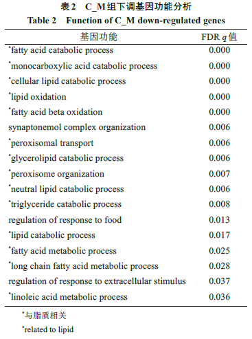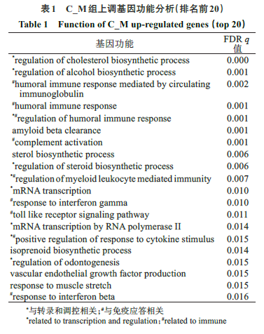 根据GOBP显著性评分结果,分别归纳两组中表达上调与下调基因集的功能。取排名前20的C_M显著上调基因功能(表1),其中9个与转录和调控相关,9个与免疫应答相关;C_M下调基因共显著参与17个功能(表2),其中14个均与脂质代谢相关。M_E组因只有2个显著DEGs,无GOBP显著性评分结果,无法进行功能分析与归纳。