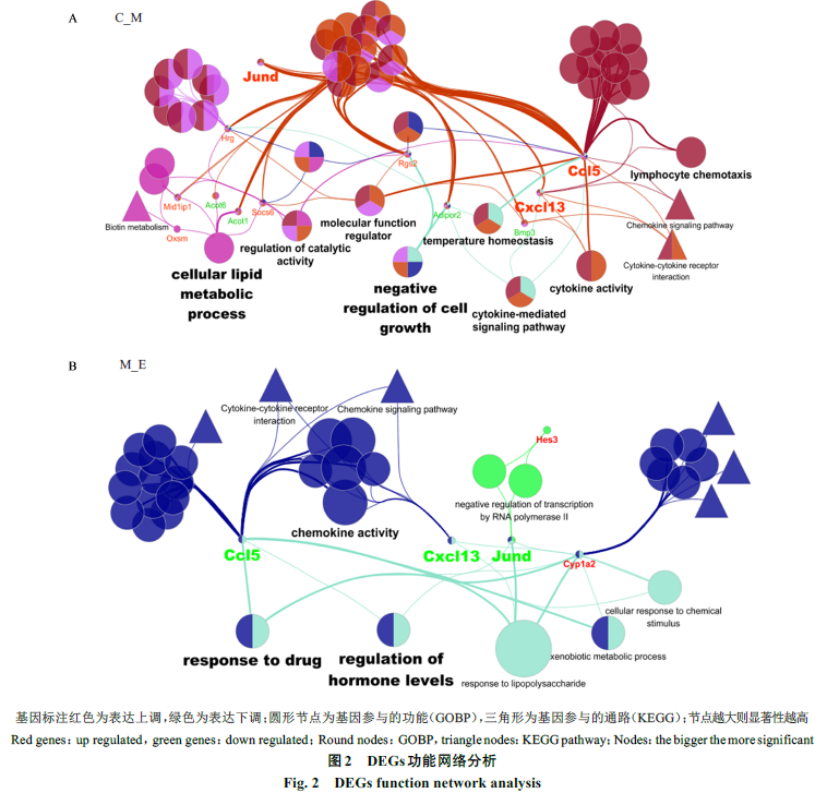 3.2.1C_M组DEGs功能如图2-A所示,C_M组DEGs显著参与脂质代谢、细胞生长负向调控等功能。其中Acot1、Acot6、Oxsm、Socs6和Mid1ip1主要参与脂质代谢过程(cellular lipid metabolic process);Ccl5、Cxcl13、Bmp3和Adipor2通过趋化因子与细胞因子介导的信号通路发挥趋化作用(cytokine-mediated signaling pathway)以及对于温度变化产生的自稳态调节作用(temperature homeostasis),并与Jund、Hrg、Rgs2、Socs6共同参与细胞生长调控(negative regulation ofcell growth)。