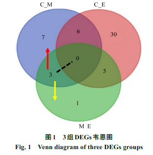 3.1.1DEGs分析结果对照组、模型组和EFPS组3组间两两比对,共得对照/模型(C_M)组、模型/给EFPS(M_E)组、对照/EFPS组(C_E)3组DEGs。各组DEGs异同关系如图1所示,其中C_M与M_E组均为单变量,C_E组为双变量。C_M与M_E交集有Ccl5、Cxcl13、Jund3个基因,在C_M中全部上调,在M_E中全部下调,且在C_E中均未差异表达,可见此3个基因在C_M与M_E中的等量共表达模式,即与对照组比较,Ccl5、Cxcl13、Jund3个基因在模型组中表达上调;与模型组比较,EFPS给药后等量回调。