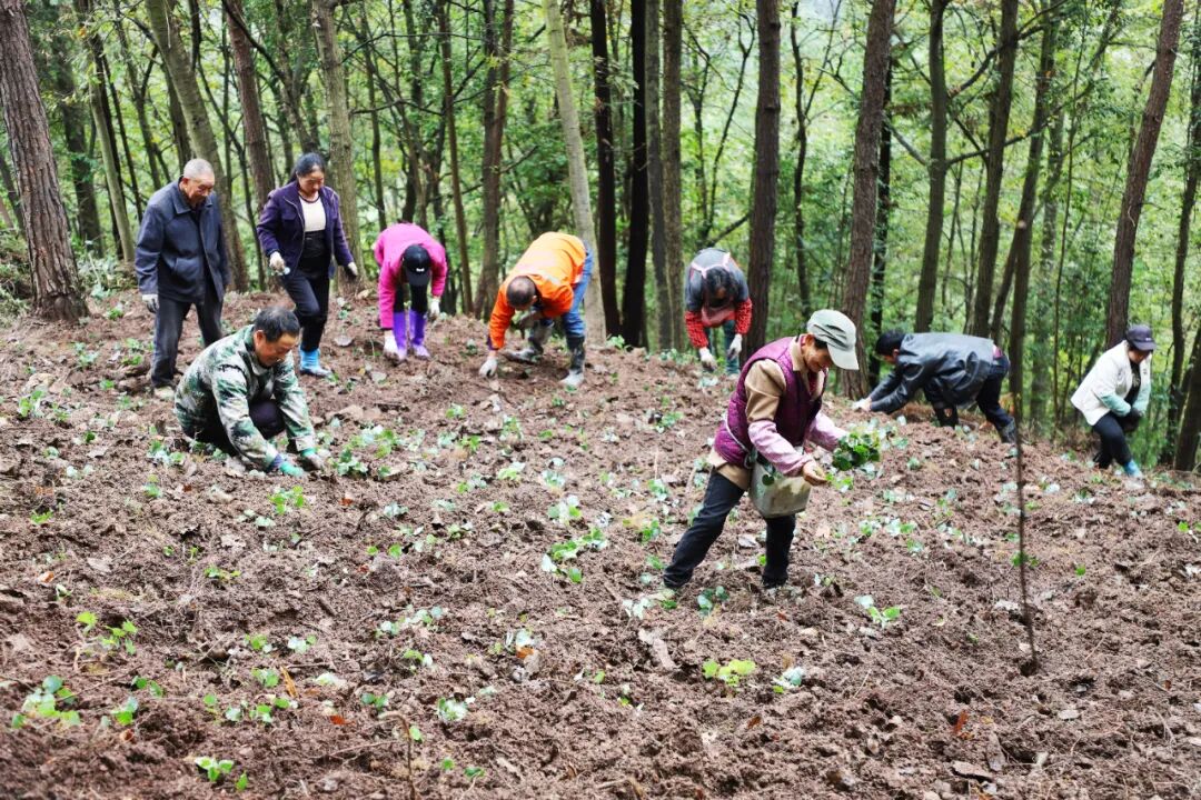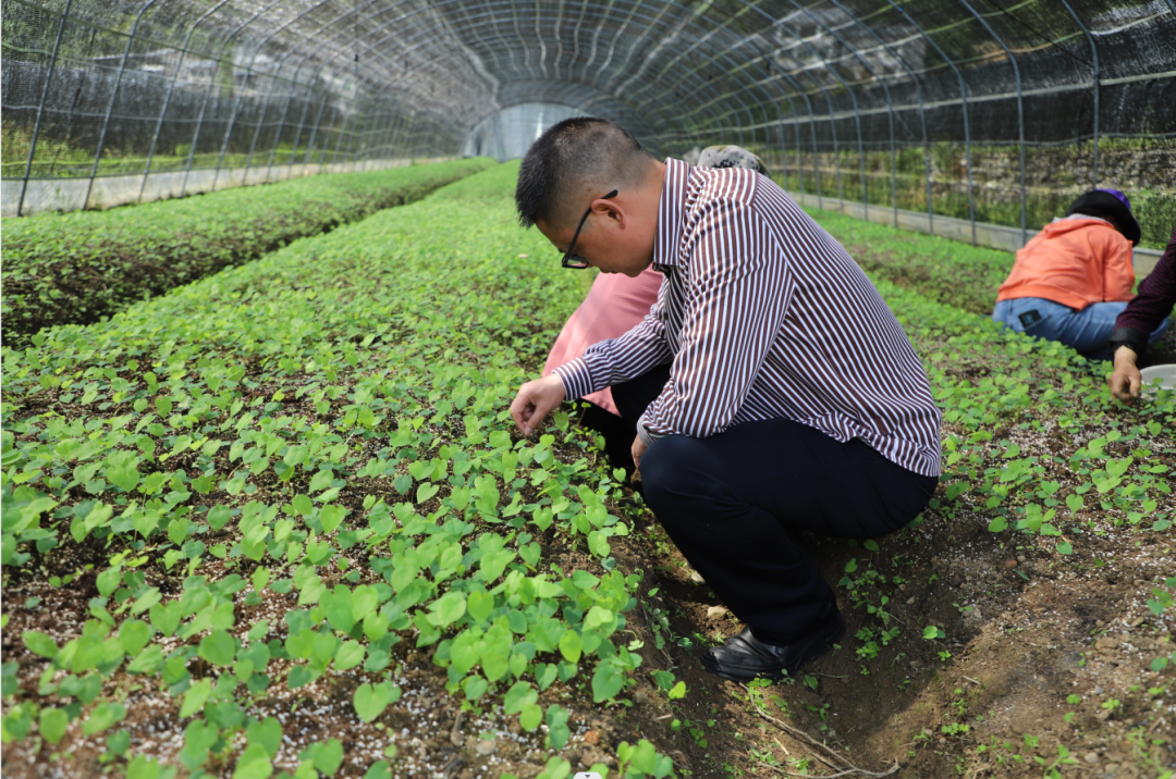 图:储备林项目工作人员查看淫羊藿种苗生长情况