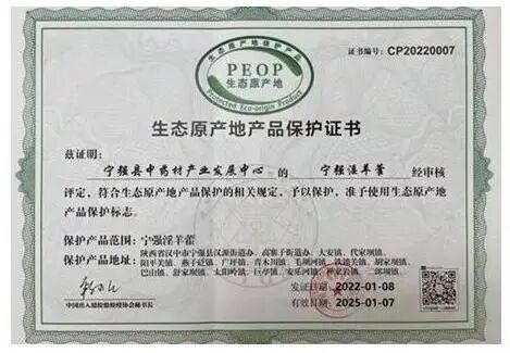 2022年1月8日,宁强淫羊藿取得国家生态原产地保护产品认证。