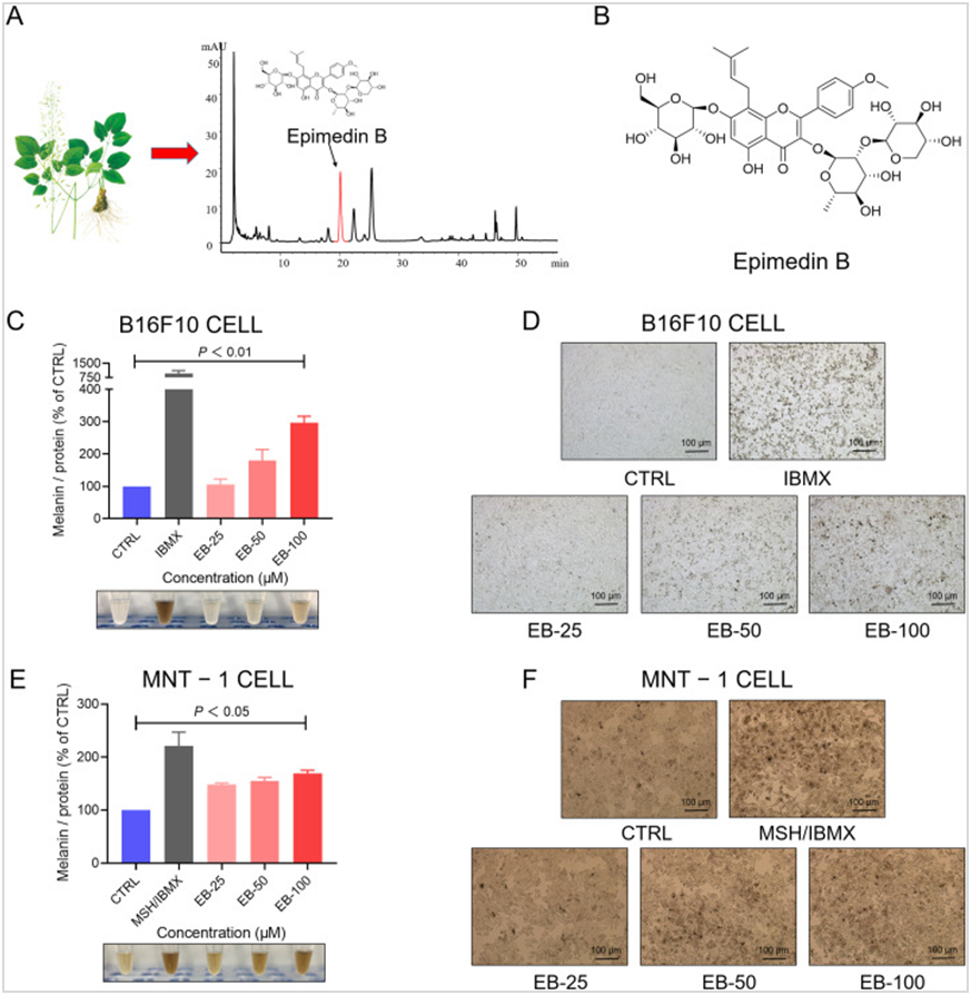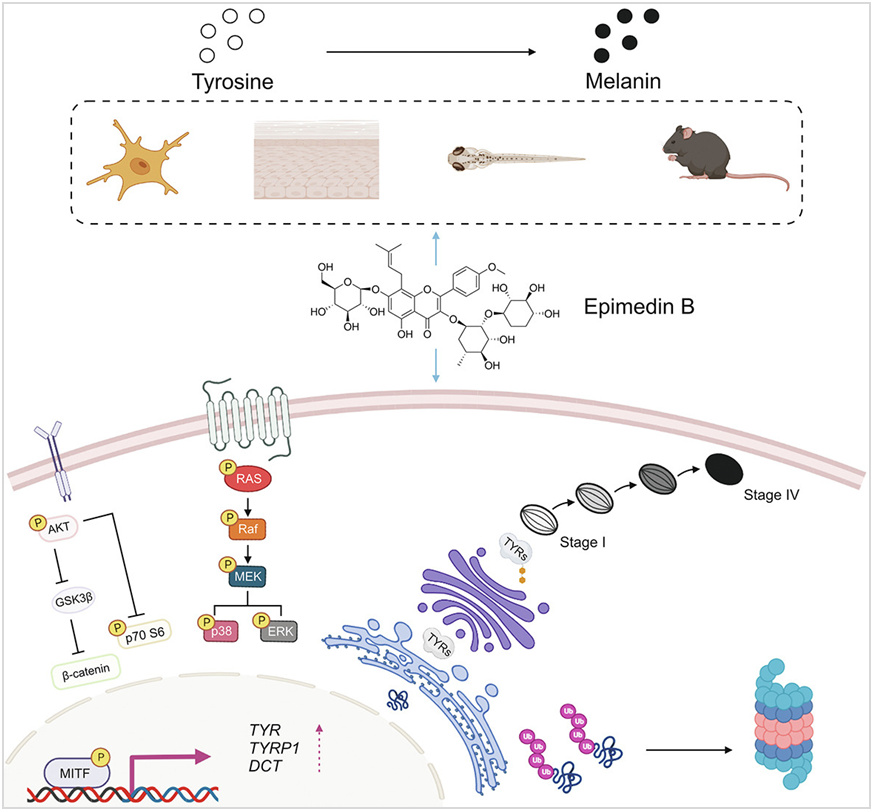 Hong C, Zhang Y, Yang L, Xu H, Cheng K, Lv Z, Chen K, Li Y, Wu H. Epimedin B exhibits pigmentation by increasing tyrosinase family proteins expression, activity, and stability. J Pharm Anal. 2024 Jan;14(1):69-85. doi: 10.1016/j.jpha.2023.09.006. Epub 2023 Sep 9. PMID: 38352950; PMCID: PMC10859565.