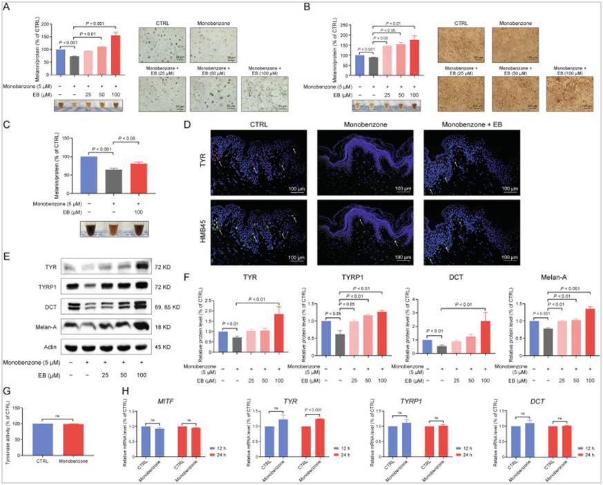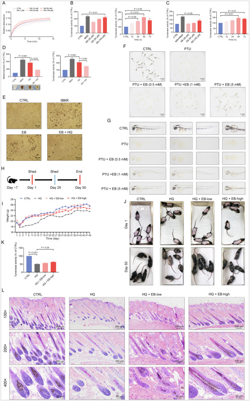 在黑色素合成中,TYR是催化限速步骤(L-酪氨酸羟基化为L-多巴)的关键酶。作者接着研究了EB对TYR催化活性的影响,发现EB体外可以加速TYR与底物左旋多巴的反应速率,在细胞内以剂量依赖性方式显著增强TYR活性。进一步在斑马鱼和小鼠中开发了两种使用TYR抑制剂的脱色模型,确定了EB可以作为TYR激活剂并在体内发挥重新色素沉着作用。此外,在HQ引起的色素脱失模型中,EB有效地重新激活了皮肤TYR活性。数据表明EB通过在体外和体内促进TYR活性来发挥色素沉着作用(图6)。
