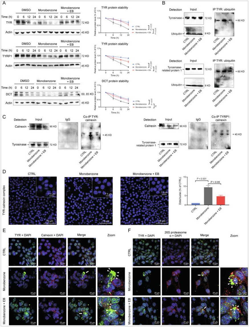 莫诺苯宗会导致TYR降解,但不影响TYR转录水平。为了研究EB是否对TYR稳定性有影响,作者使用CHX抑制蛋白质合成,以排除EB本身,诱导新的合成TYR。WB发现莫诺苯宗显著降低了TYRs的稳定性,而EB处理可以有效防止这种情况,这表明EB改善了莫诺苯宗诱导的TYRs稳定性。进一步机制研究发现EB通过防止莫诺苯宗诱导的异常TYR、TYRP1形成、在内质网中的保留以及泛素-蛋白酶体降解系统的增强来提高TYR、TYRP1稳定性(图8)。