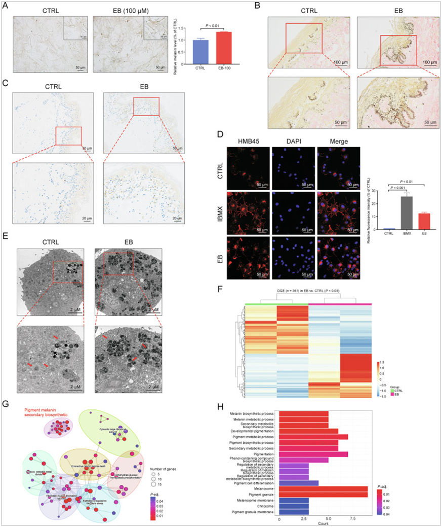 接着收集并检查了人体皮肤组织样本进一步验证EB的促黑色素生成作用,发现EB在原代黑素细胞、人类皮肤器官培养物中诱导显著的黑色素生成作用。黑色素在黑素体中合成并储存,然后分布到周围的角质形成细胞,黑素体的数量、大小和成熟阶段反映了黑素细胞的黑色素生成能力。作者发现EB治疗组中存在比对照组更多的黑素体,此外EB通过增加黑素体数量并促进黑素体成熟来刺激黑色素生物合成。接着对EB处理和未处理的人类原代黑素细胞进行了转录组分析,差异基因显著富集在黑色素生物合成过程、黑素体/黑素体膜等,这些数据证实了EB在黑色素生物合成和黑素体形成中的调节作用(图3)。