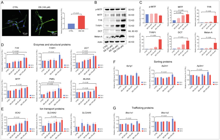 为了阐明EB诱导黑素生成的机制,作者研究了TYR的参与,发现EB诱导的TYR在mRNA和蛋白质水平上的双重正向调节。MITF是众所周知的TYR关键调节因子,也是黑素生成的主要调节因子。作者发现EB刺激后MITF的mRNA和蛋白表达水平显著上调,表明EB通过经典的MITF依赖性机制上调黑素生成中TYR的表达。此外,EB可以影响转运相关基因的mRNA表达,特别是OCA2和SLC45A2,表明EB在黑素体生物发生和成熟中调节复杂的过程,这可能解释黑素体增加的变化黑素体中黑色素的数量和含量(图4)。