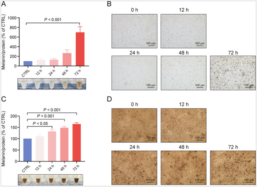 进一步在不同时间点(0、12、24、48和72小时)检查黑色素含量,发现EB以时间依赖性方式诱导的黑色素生成(图2)。