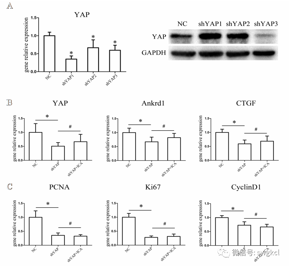 预先设计3种不同序列的shRNA(shYAP1、shYAP2和shYAP3),采用qPCR和Western Blot的方法筛选出最佳序列shYAP3(见图3A),将其应用于后续实验。随着YAP基因的沉默,靶基因(CTGF和Ankrd1)以及增殖相关基因(PCNA、Ki67和CyclinD1)的表达被显著抑制,而且淫羊藿苷不再促进这些基因的表达(见图3B、图3C)。Western Blot结果显示由于YAP的沉默,CTGF和PCNA蛋白的表达被抑制,同时,淫羊藿苷不再促进CTGF和PCNA蛋白的表达。