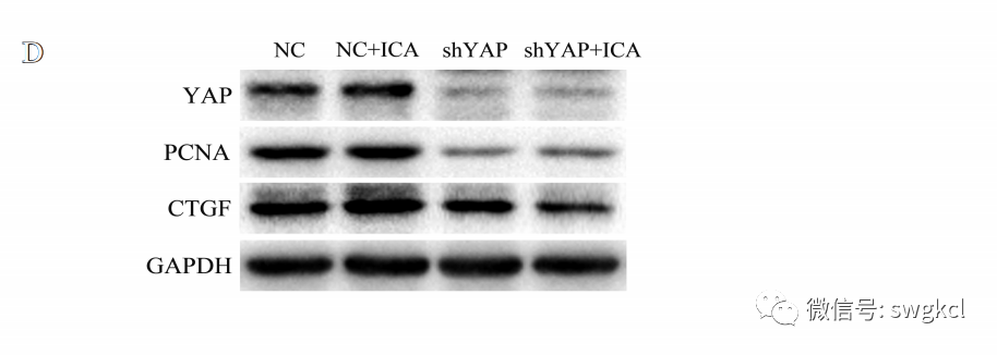 图3 沉默YAP基因后,淫羊藿苷对YAP靶基因及增殖相关基因表达的影响:A. 三条shRNA序列对YAP基因的沉默效果;B. 沉默YAP基因后,YAP及其靶基因(CTGF和Ankrd1)的表达,以及淫羊藿苷对这些基因表达的作用;C. 沉默YAP基因后,增殖相关基因(PCNA,Ki67和CyclinD1)的表达,以及淫羊藿苷对这些基因表达的作用;D. 沉默YAP基因后,PCNA和CTGF蛋白的表达,以及淫羊藿苷对这些蛋白表达的作用