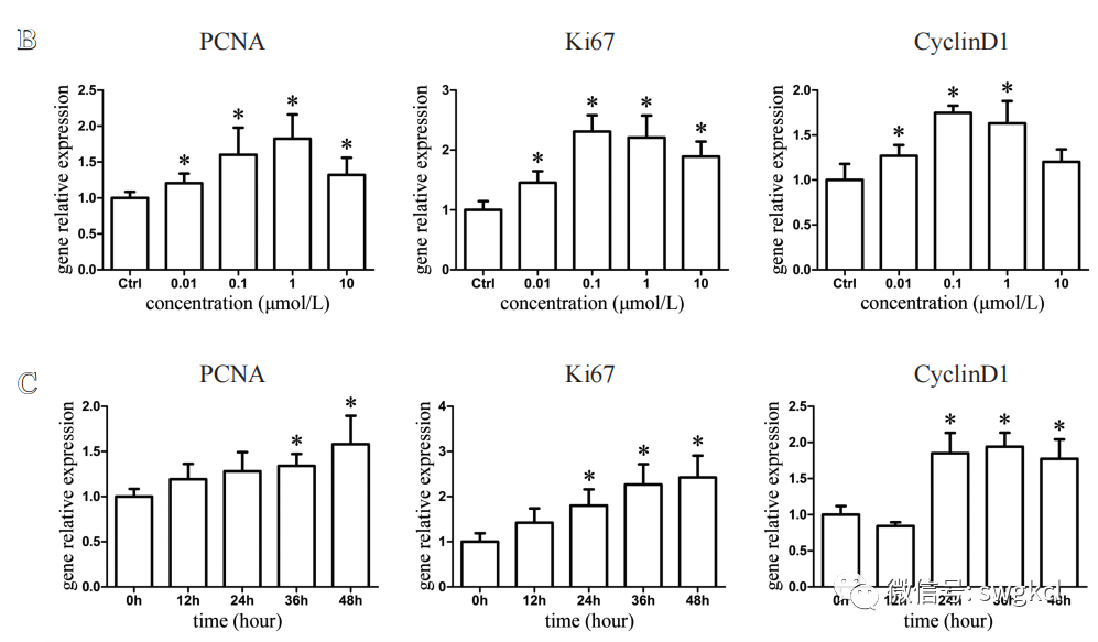 用0.01、0.1、1和10 μmol/L的淫羊藿苷干预软骨细胞,2 d后检测Ki67、PCNA、CyclinD1、YAP、Ankrd1和CTGF基因的表达情况。用1 μmol/L的淫羊藿苷干预软骨细胞,分别干预0、12、24、36和48 h,然后检测Ki67、PCNA和CyclinD1基因的表达情况。干预方法为:0 h组用常规培养基培养48 h;12 h组用常规培养基培养36 h后,加入1 μmol/L的淫羊藿苷继续培养12 h;24 h组用常规培养基培养24 h后,加入1 μmol/L的淫羊藿苷继续培养24 h;36 h组用常规培养基培养12 h后,加入1 μmol/L的淫羊藿苷继续培养36 h;48 h组加入1 μmol/L的淫羊藿苷培养48 h。软骨细胞在Trizol试剂中裂解后,用总RNA提取试剂盒提取细胞裂解中的总RNA。采用cDNA合成试剂盒将RNA逆转录为cDNA。实时定量PCR在含有2×SYBR green、引物、cDNA和双蒸馏水的20 μL反应体积中进行。引物序列如下:PCNA forward 5’-AAGGGCTGAAGATAATGCTGATA-3’, PCNA reverse 5’-CATATACGTGCAAATTCACCAGAT-3’;Ki67 forward 5’-CGGAGCACTTTGAAACACCA-3’, Ki67 reverse 5’-TGTCACGGCAGAGAGTTCTT-3’;CyclinD1 forward 5’-TGCGTGCAGAGGGAGATTGT-3’, CyclinD1 reverse 5’-GCGGATAGAGTTGTCAGTGTAGATG-3’;YAP forward 5’-ACCCTCGTTTTGCCATGAAC-3’, YAP reverse 5’-CCTGCCGAAATAACTCCTGC-3’;Ankrd1 forward 5’- TGGCAGAATGGAACCAAAGC-3’, Ankrd1 reverse 5’-TCTCCCTATTTGGCTGGCAA-3’;CTGF forwards 5’-ACCAGTGTGAAGACCTACCG-3’, CTGF reverse 5’- GTCCCTTACTCCCTGGCTTT-3’;GAPDH forward 5’-CAAGTTCAACGGCACAGTCA-3’, GAPDH reverse 5’-CCCCATTTGATGTTAGCGGG-3’。