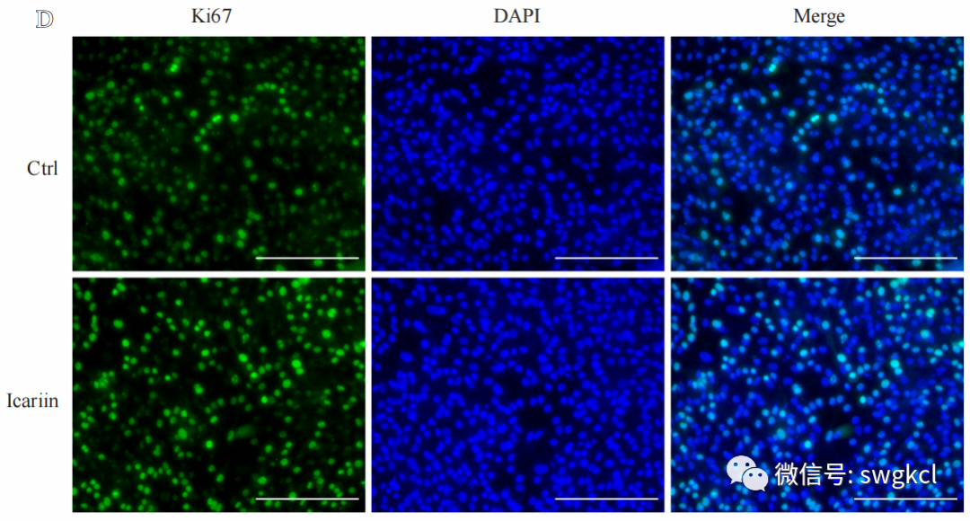 图1 淫羊藿苷对关节软骨细胞增殖及其相关基因表达的影响:A. 淫羊藿苷对细胞增殖的作用;B. 在不同浓度的淫羊藿苷作用下,Ki67、PCNA和CyclinD1基因的表达情况;C. 在淫羊藿苷干预的不同时间点,Ki67、PCNA和CyclinD1基因的表达情况;D. 淫羊藿苷对Ki67蛋白表达的影响