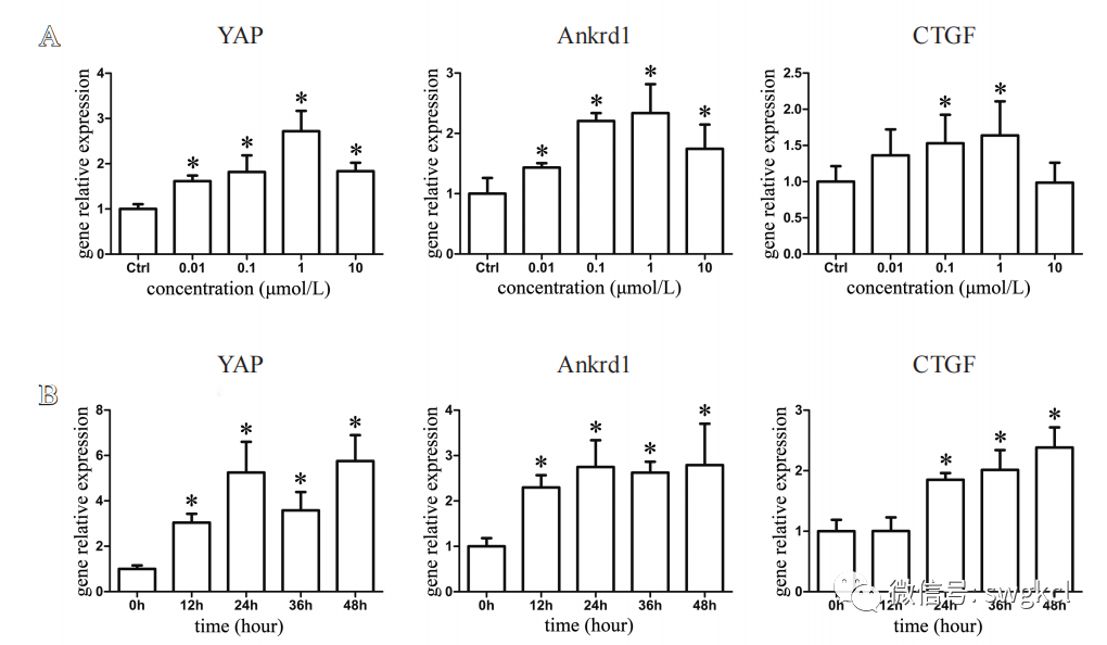 图2 淫羊藿苷对YAP及其靶基因表达的影响。A. 在不同浓度的淫羊藿苷作用下,YAP及其靶基因(Ankrd1和CTGF)的表达情况;B. 在淫羊藿苷干预的不同时间点,YAP及其靶基因(Ankrd1和CTGF)的表达情况。