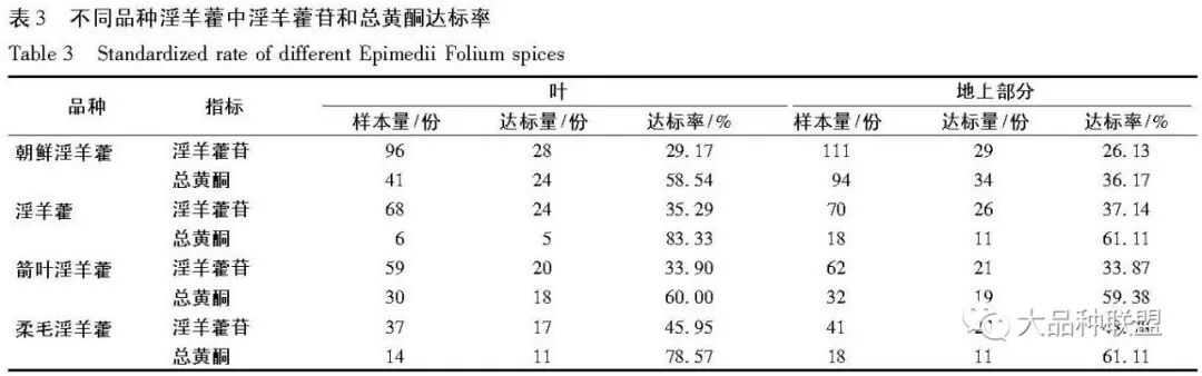 此外对其他淫羊藿含量测定相关文献中关于不同品种淫羊藿苷和总黄酮的含量进行统计,结果表明各个不同品种淫羊藿均存在含量不符合药典要求的现象,见表3。