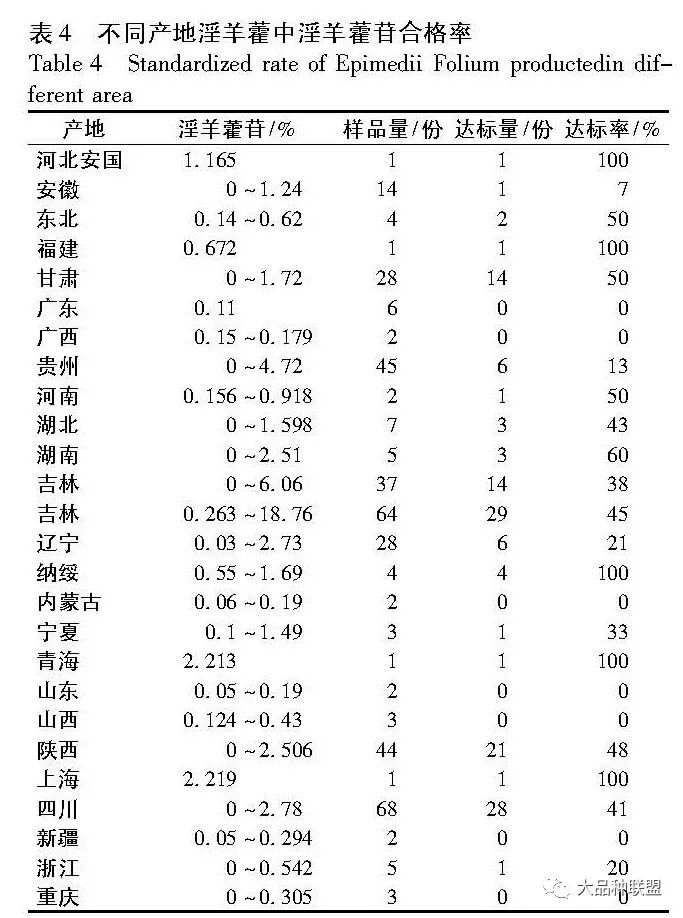综上述可知,各不同产地淫羊藿质量不一,同一个产地的淫羊藿中淫羊藿苷和黄酮的含量差异也很大,且多数淫羊藿中淫羊藿苷的含量不合格,由表4也可以看出甘肃产淫羊藿合格率较高。甘肃大部分地区气候干燥,多数研究证明甘肃产淫羊藿中淫羊藿苷的含量合格的说法,与古籍中所载生处不闻水声者良的说法一致。可能是由于干燥的气候有利与淫羊藿中淫羊藿苷类成分的积累。此结论也可为淫羊藿规范化种植提供参考。