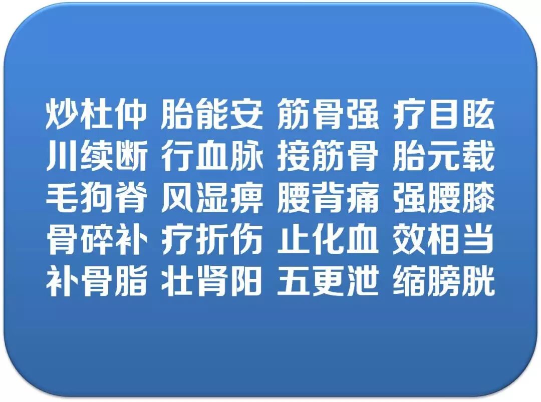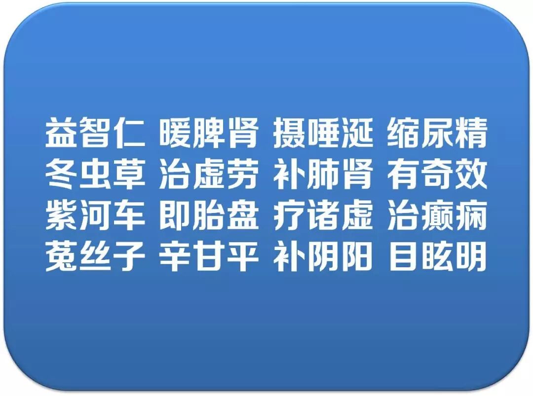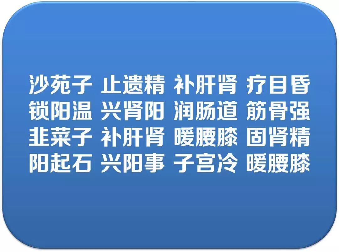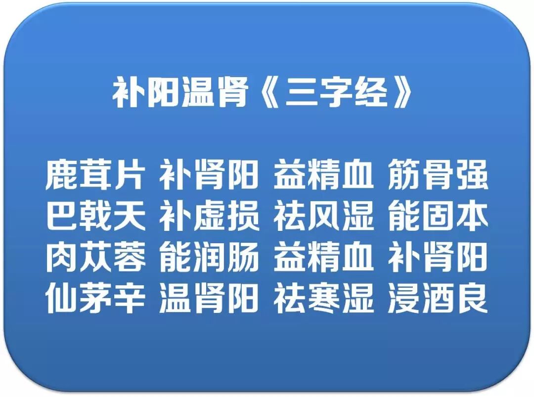 一、《太平惠民和剂局方》卷五:安肾丸【处方】肉桂(去粗皮,不见火)川乌(炮,去皮、脐)各500克 桃仁(麸炒)白蒺藜(炒,去刺)巴戟(去心)山药 茯苓(去皮)肉苁蓉(酒浸,炙)石斛(去根,炙)萆薢 白术 破故纸各1.5千克【制法】上药为末,炼蜜为丸,如梧桐子大。【功能主治】壮阳益肾。肾经积冷,下元虚惫,目暗耳鸣,四肢无力,夜梦遗精,小便频数,脐腹撮痛,食少体瘦,惊恐健忘,大便溏泻。【用法用量】每服30丸,空腹时用温酒或盐汤送下;小肠气者,用炒茴香盐酒送下。【摘录】《太平惠民和剂局方》卷五二、《全国中药成药处方集》(天津方):龟龄集【处方】鹿茸(去毛)770克 人参(去芦)620克 熟地180克 制山甲240克(用苏合油60克制)生地240克 石燕300克(用鲜姜30克制)苁蓉(酒蒸)270克 家雀脑100个 地骨皮120克(用蜜30克制)杜仲炭(盐炒)60克 甘草30克(用蜜6克制)天冬120克(用黄酒30克制)枸杞子90克(用蜜30克制)川牛膝120克(用黄酒90克制)大蜻蜓(去足、翔)60克 海马300克(用苏合油90克制)大青盐(清炒)240克 淫羊藿60克(用牛乳30克制)蚕蛾(去足、翅)27克 故纸90克(用黄酒60克制)砂仁120克 锁阳90克(用黄酒60克制)硫黄9克 菟丝子90克(用黄酒助克制)急性子75克(水煮)细辛45克(用醋45克制)公丁香75克(用川椒6克炒,去川椒)生黑附子560克(用清水煮一次,用醋560克煮一次,用蜜90克制)【制法】用方内家雀脑、硫黄二味装入猪大肠内,用清水煮之,至硫黄和家雀脑溶合一起时倒出,去猪大肠,晒干;再合以上药轧成粗面,装入银桶内蒸之,蒸至三十二小时,将粗面倒出,再将朱砂面75克,和药面和匀,再装入银桶内继续蒸三十二小时,倒出晾干装瓶,每瓶装3克。【功能主治】益肾助阳,大补真元。治阳气虚弱,盗汗遗精,筋骨无力,行步艰难,头昏眼花,神经衰弱,妇女气虚血寒,赤白带下。【用法用量】每瓶分十次服,白开水送下。【摘录】《全国中药成药处方集》(天津方)三、《中国药典》:五子衍宗丸【处方】枸杞子400g 菟丝子(炒)400g 覆盆子200g 五味子(蒸)50g 车前子(盐炒)100g【性状】为棕褐色的水蜜丸、棕黑色的小蜜丸或大蜜丸;味甜、酸、微苦。【炮制】以上五味,粉碎成细粉,过筛,混匀。每100g粉末用炼蜜35~50g加适量的水泛丸,干燥,制成水蜜丸;或加炼蜜80~90g制成小蜜丸或大蜜丸,即得。【功能主治】补肾益精。用于肾虚腰痛,尿后余沥,遗精早泄,阳痿不育。【用法用量】口服,水蜜丸一次6g,小蜜丸一次9g,大蜜丸一次1丸,一日2次。【规格】大蜜丸每丸重9g【贮藏】密封。【摘录】《中国药典》四、《妇产科学》:二仙汤【处方】仙茅9克 仙灵脾9克 当归9克 巴戟天9克 黄柏4.5克 知母4.5克【功能主治】温肾阳,补肾精,泻肾火,调冲任。主妇女月经将绝未绝。周期或前或后,经量或多或少,头眩耳鸣,腰酸乏力,两足欠温,时或怕冷,时或轰热,舌质淡,脉沉细者。现用于妇女更年期综合症、高血压、闭经,以及其它慢性疾病见有肾阴、肾阳不足而虚火上炎者。【用法用量】日服一剂,水煎取汁,分二次服。可随症加益母草9克、桑寄生9克、杜仲9克以补肾调经;或加枸杞子9克,白菊花6克以平虚阳。【备注】方中仙茅、仙灵脾、巴戟天温肾阳,补肾精;黄柏、知母泻肾火、滋肾阴;当归温润养血,调理冲任。全方配伍特点是壮阳药与滋阴泻火药同用,以适应阴阳俱虚于下,而又有虚火上炎的复杂症侯。由于方用仙茅、仙灵脾二药为主,故名"二仙汤"。