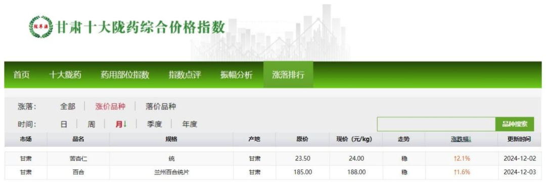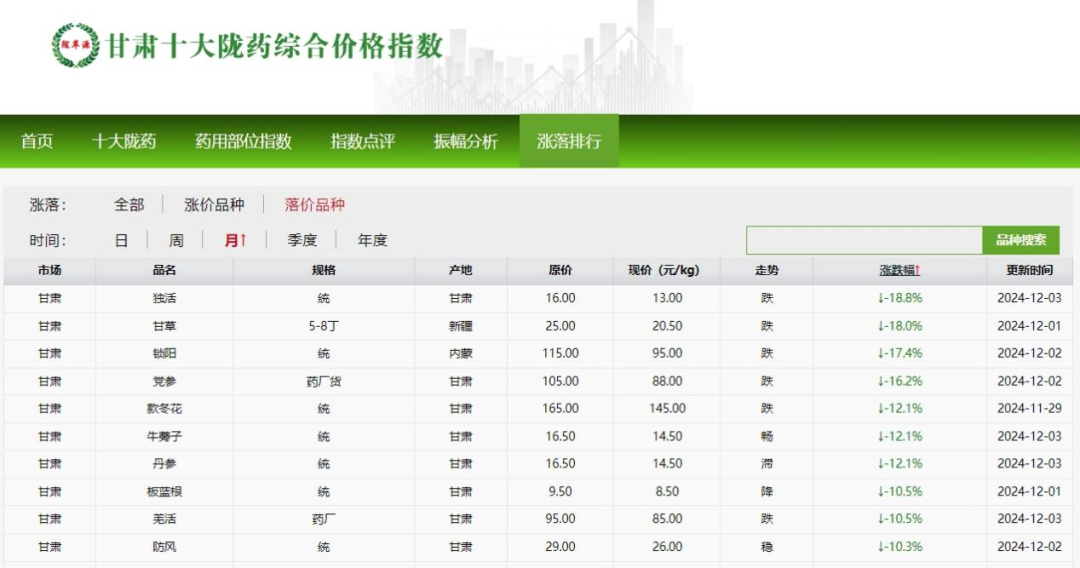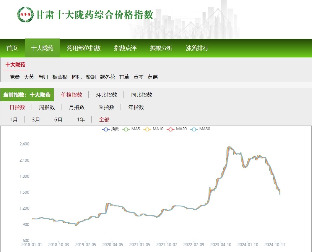 甘肃十大陇药(当归、黄芪、党参、大黄、板蓝根、枸杞、柴胡、款冬花、甘草、黄芩)价格监测显示,2024年11月份甘肃十大陇药价格指数为1557.34点(以2018年1月份平均价格为基期),与上期1656.80点(2024年10月)相比,下跌99.47点,跌幅6%。