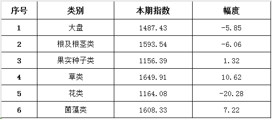 (2)果实种子类:上月指数1141.27点,本月指数1156.39点,上涨15.12点,涨幅1.32%。