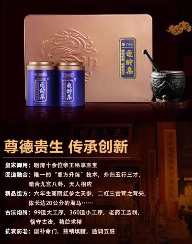 拥有近500年历史的龟龄集,自创制于明朝以来,就深受明清两朝十八位帝王的青睐,不仅把它作为有助于延续皇室血脉的补肾良药,还将其视为延年益寿的养生佳品。据悉在80年代,国内诸多的中医药专家与历史学者,通过针对北京与台北的故宫博物院关于明清皇家医案的研究中发现,龟龄集的确与明清两朝历代帝王日常生活密切相关,类似的记录随处可见。