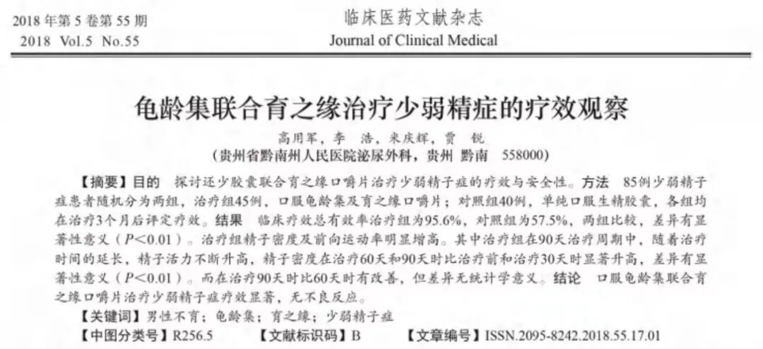 临床医药文献杂志2018年第5卷第55期《龟龄集联合育之缘治疗少弱精症的疗效观察》中明确指出,口服龟龄集胶囊联合育之缘口嚼片治疗少弱精症的疗效显著。