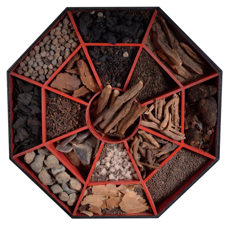 五行则是指中国民间传统说法中的金木水火土。根据阴阳五行之说,药方中的药材在颜色上五色俱全,如:红色的枸杞子、黑色的熟地黄、青色的石燕、黄色的天冬、白色的大青盐;在味道上五味俱全,如:陈醋的酸味、蜂蜜的甜味、大青盐的咸味、生姜的辛辣、黄酒辛辣和略带苦涩的味道。