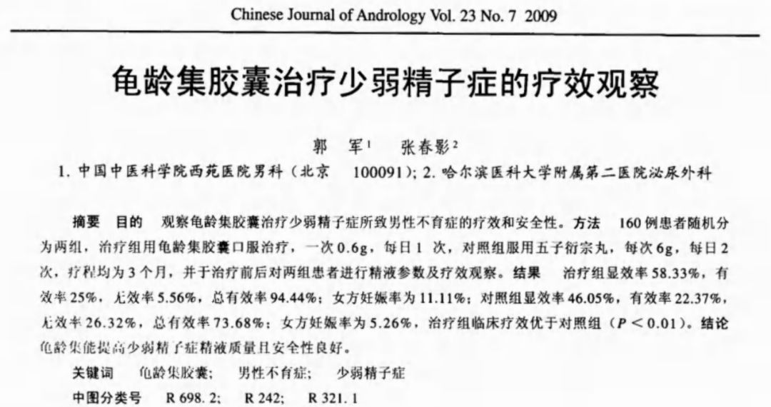 中国男科学杂志2009年第23卷第7期《龟龄集胶囊治疗少弱精子症的疗效观察》中明确指出,龟龄集能提高少弱精子症精液质量且安全性良好。