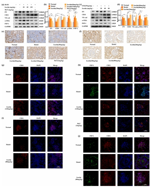 肾EndMT对肾纤维化病理过程具有促进作用。研究探讨了淫羊藿苷对2型糖尿病动物肾EndMT的影响。在2型糖尿病动物的肾组织中,与内皮细胞特征相关的蛋白表达显著降低,而与间充质细胞特征相关的蛋白表达明显上升(图3a-d)。经过12周的db/db小鼠和2型糖尿病大鼠联合治疗,CD31、VE-cad、FN、α-SMA和FSP-1的表达得以恢复。